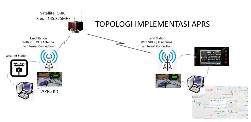 Secara keseluruhan bagian dari APRS Kit terdiri dari 3 bagian : sensor input, ESP8266 sebagai processor dan Arduino yang berfungsi sebagai TNC(gambar atas) dan bisa diimplementasikan dengan topology sebagai berikut.