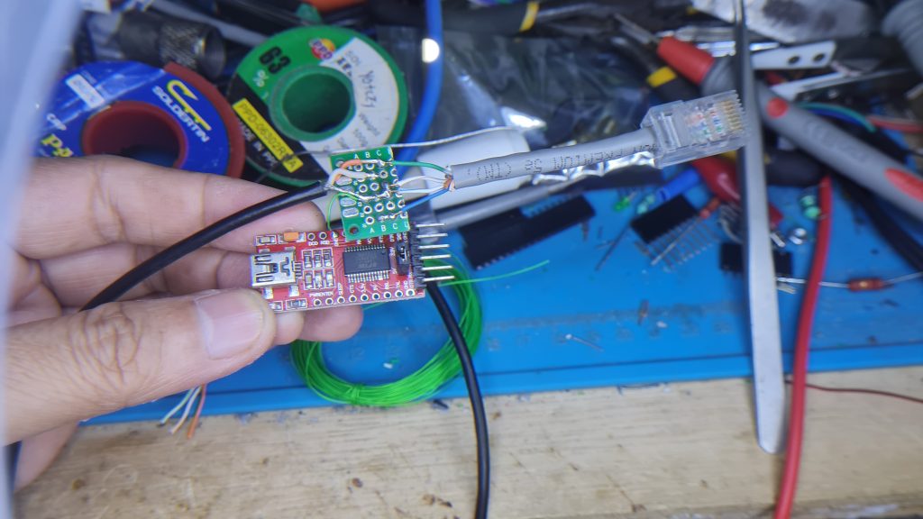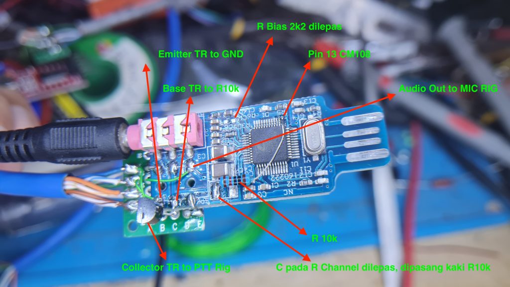 Modifikasi CM108 dilakukan pada female audio connector (jack female warna hijau) dan menyesuaikan dengan design input mic pada Icom 2300H (menggunakan connector RJ45).