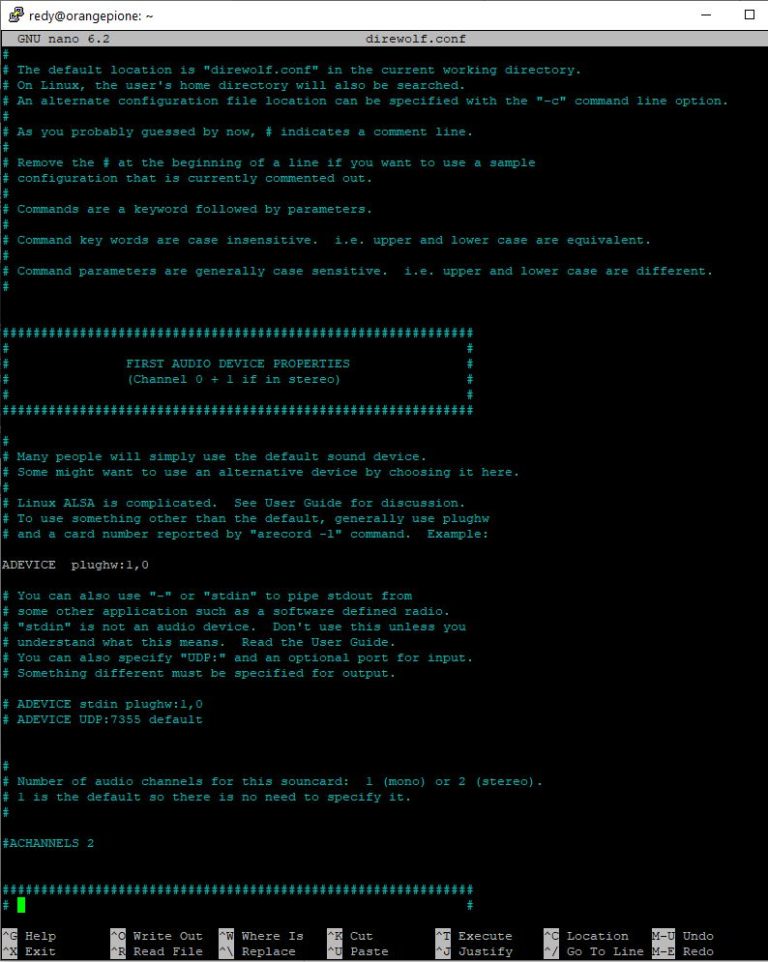 sebelum running DIREWOLF, musti dilakukan edit config dari files direwolf.conf, dengan ~$ sudo nano direwolf.conf